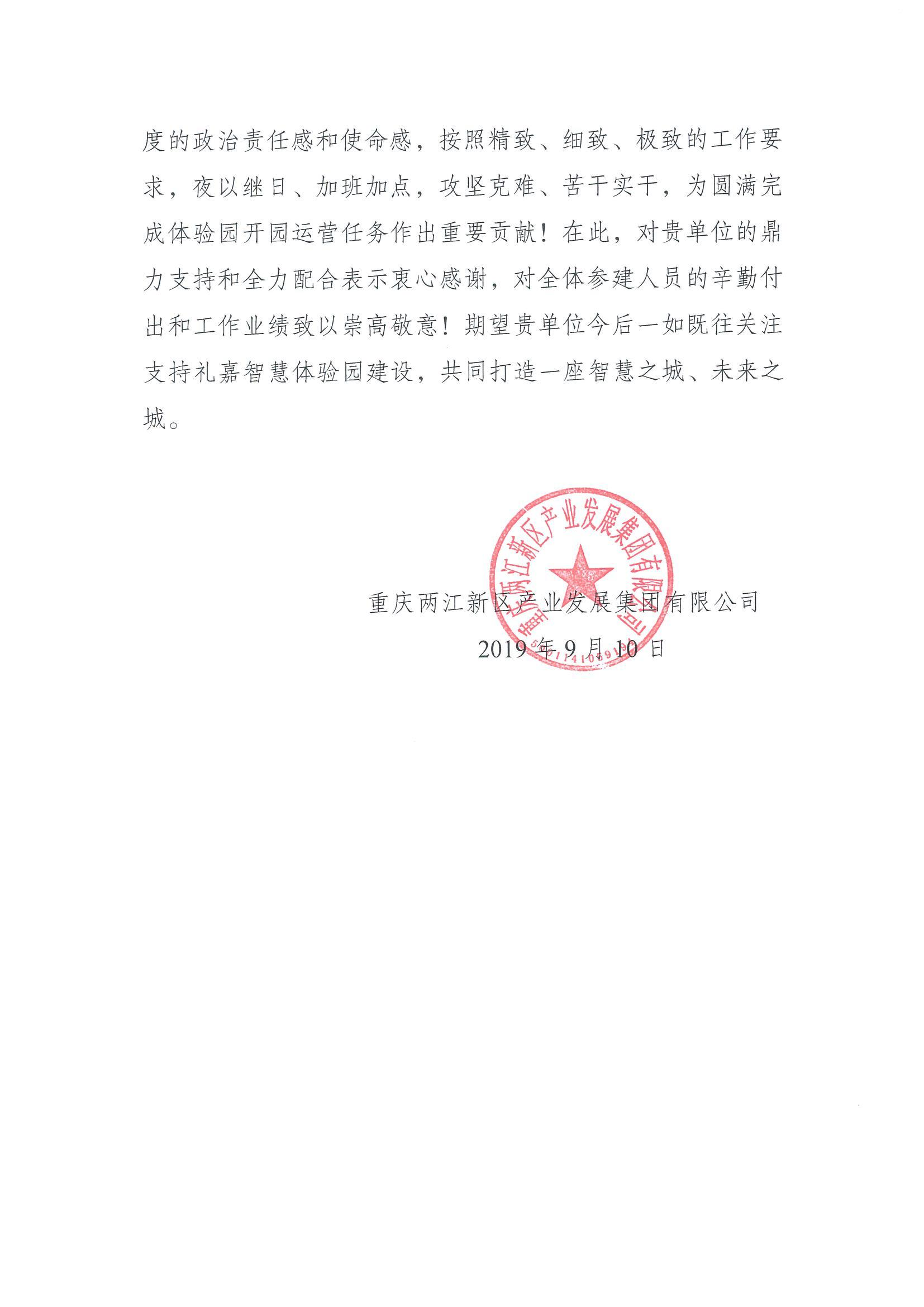 禮嘉智慧公園一期工程管理三部獲業主感謝信