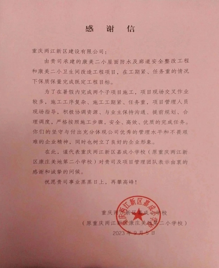 這一封封感謝信,不僅是對兩江建設公司工作的肯定,更是公司后續工作的強勁動力。接下來,我司將繼續為促進兩江新區教育事業高質量發展貢獻自己的一份力量。